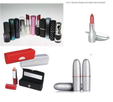 En l’espèce, pour conclure à l’absence de caractère distinctif de la forme du rouge à lèvres en cause, après avoir défini le public pertinent et décrit ladite forme, la Chambre de recours de l’EUIPO avait considéré que les rouges à lèvres usuels existant sur le marché, dont des exemples avaient été relevés à titre d’illustration (ci-dessous) et qui selon elle étaient tous d’une forme cylindrique, « n’étaient pas considérablement différents » et que les consommateurs « étaient habitués aux contenants de forme ovale ».