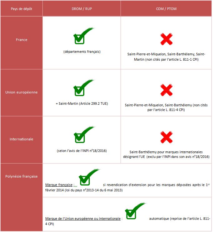 Selon l'avis n° 18/2016 de l’INPI adressé à l’OMPI en avril 2016 relatif à l'Arrangement et au Protocole de Madrid concernant l'enregistrement international des marques, "les marques internationales désignant la France (via le Protocole de Madrid) s'étendent à: Guadeloupe, Guyane française, Martinique, Mayotte, Nouvelle-Calédonie, Polynésie française, La Réunion, Saint-Barthélemy, Saint-Martin (partie française), Saint-Pierre-et- Miquelon, les Terres Australes et Antarctiques Françaises ainsi que Wallis-et-Futuna".